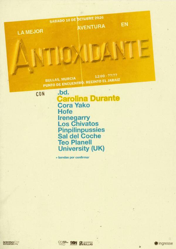 El grupo Carolina Durante formado por Diego García (voz), Mario del Valle (guitarra), Martín Vallhonrat (bajo) y Juan Pedrayes (batería) será protagonista de la próxima edición del evento “Antioxidante”. La cita tendrá lugar el sábado 10 de octubre de 2026 en el Recinto El Jaraiz de Bullas (Murcia), en una jornada comisariada por los madrileños.